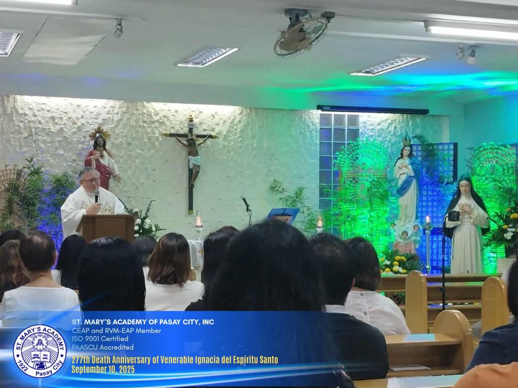 In celebration of the 𝟮𝟳𝟳𝘁𝗵 𝗗𝗲𝗮𝘁𝗵 𝗔𝗻𝗻𝗶𝘃𝗲𝗿𝘀𝗮𝗿𝘆 𝗼𝗳 𝘁𝗵𝗲 𝗩𝗲𝗻𝗲𝗿𝗮𝗯𝗹𝗲 𝗠𝗼𝘁𝗵𝗲𝗿 𝗜𝗴𝗻𝗮𝗰𝗶𝗮 𝗱𝗲𝗹 𝗘𝘀𝗽í𝗿𝗶𝘁𝘂 𝗦𝗮𝗻𝘁𝗼, 𝗙𝗼𝘂𝗻𝗱𝗿𝗲𝘀𝘀 𝗼𝗳𝘁𝗵𝗲 𝗥𝗲𝗹𝗶𝗴𝗶𝗼𝘂𝘀 𝗼𝗳 𝘁𝗵𝗲 𝗩𝗶𝗿𝗴𝗶𝗻 𝗠𝗮𝗿𝘆 𝗖𝗼𝗻𝗴𝗿𝗲𝗴𝗮𝘁𝗶𝗼𝗻, the Eucharist was held at the school chapel and livestreamed to all online classrooms.